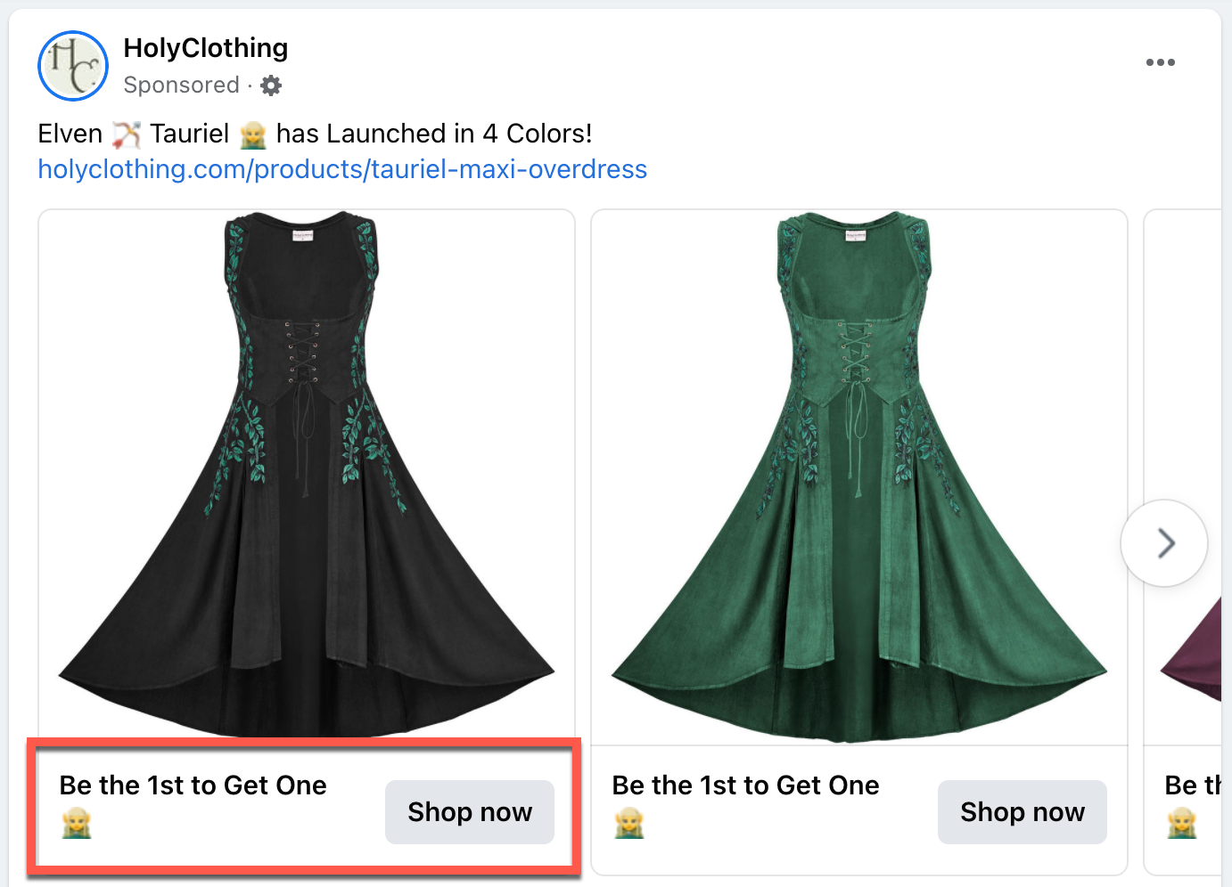 First up, check out this Facebook Ad from HolyClothing. This carousel post has minimal, but effective copy that entices the view to be among the first to order their latest style.