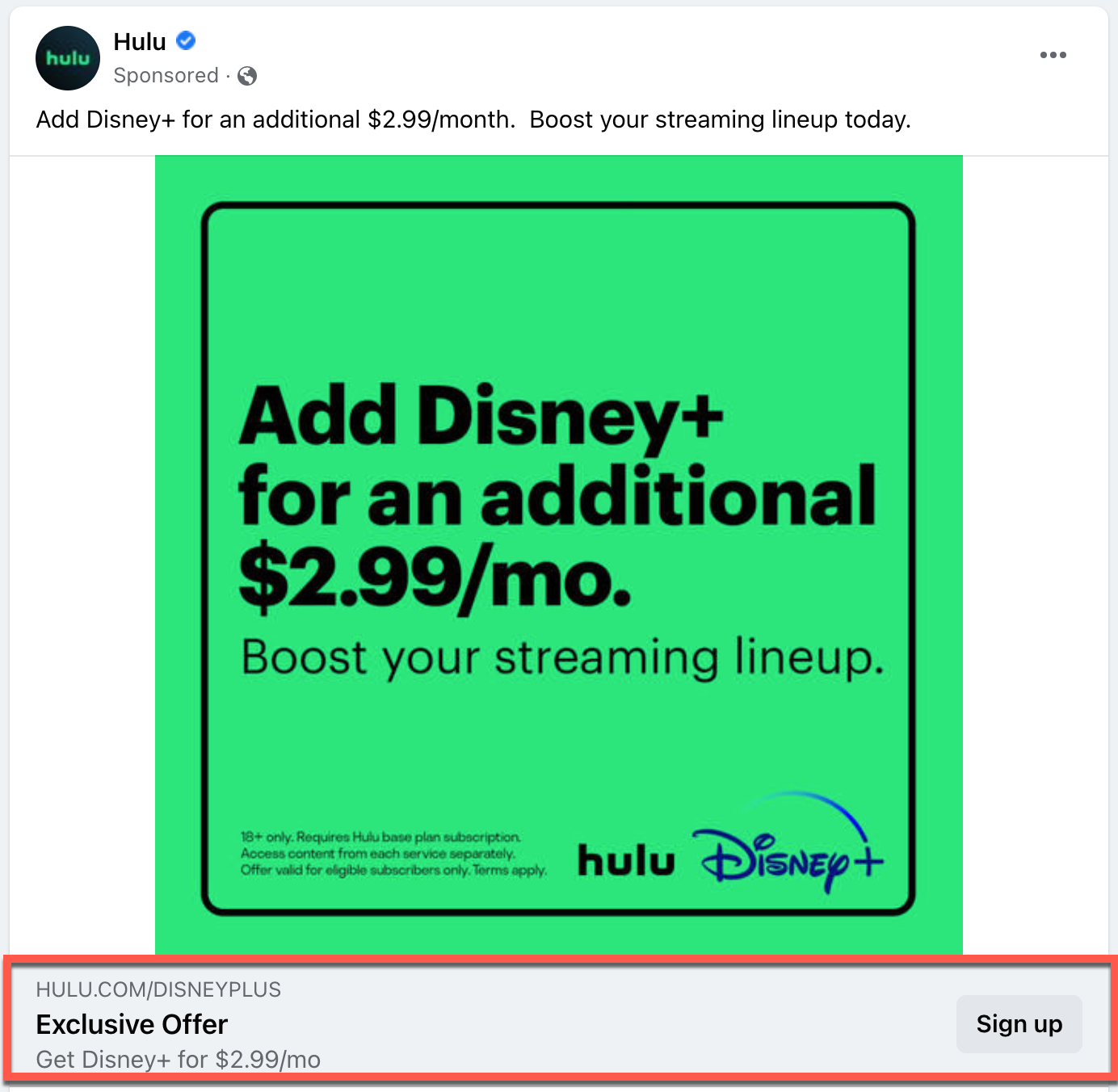 This sponsored Hulu post from Instagram is advertising a Disney+ upsell to subscribers. The post uses both concise copy, a CTA button, and an image that adds extra context to the offer.