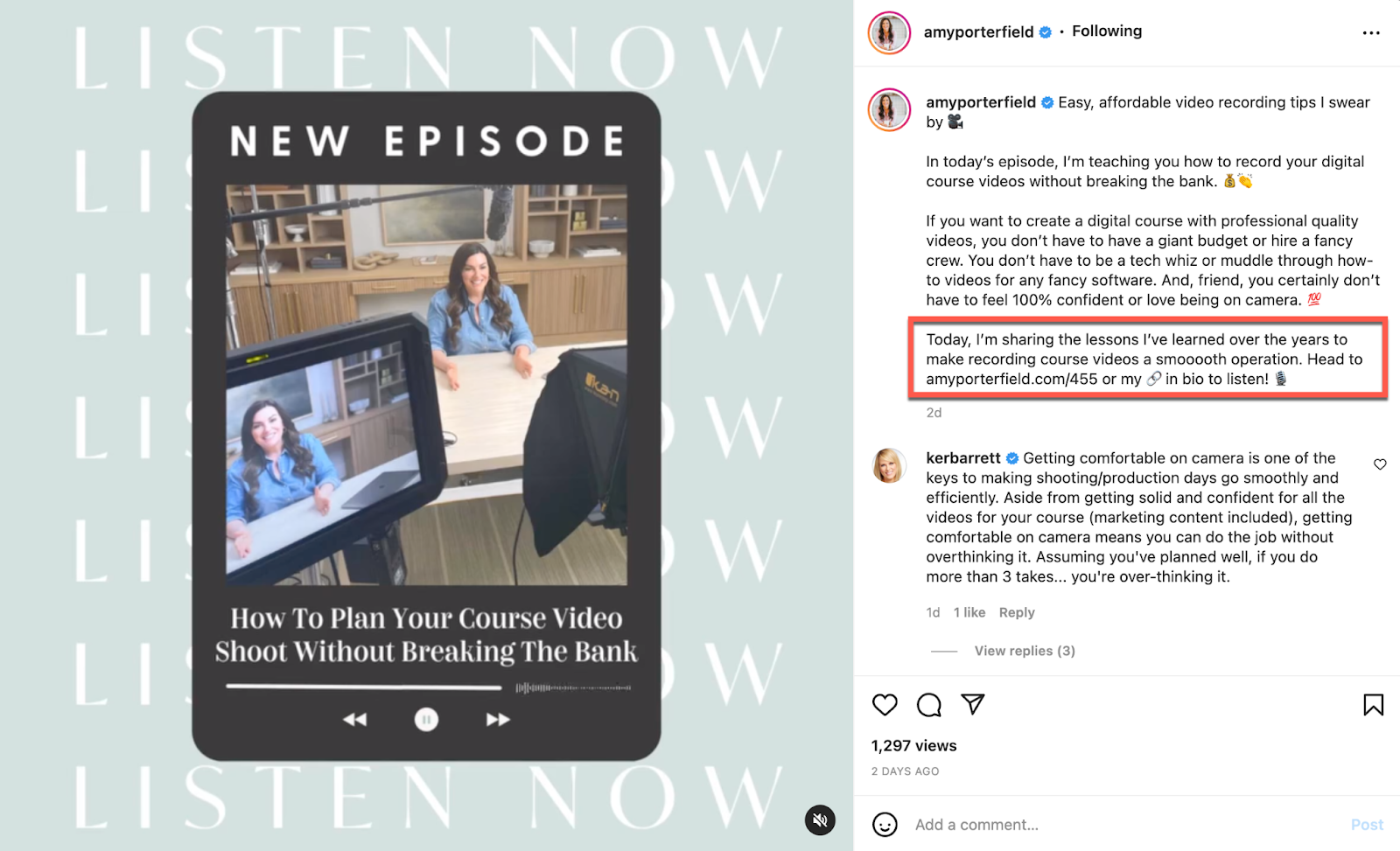 Next, this native Instagram post from Amy Porterfield uses an in-caption CTA. In this case, Amy drives users to the link in her bio to listen to her latest podcast episode.