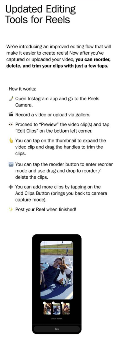 Great news for anyone regularly using Instagram Reels – Instagram has recently updated the editing process within Reels to make it easier to trim and re-arrange your video clips in the Reels composer.The new editing process will allow you to more easily edit each clip by tapping on the thumbnail and cutting down the specific segment you want to trim to. You can then re-order each of your clips in the new ‘Re-Order Mode’, simplifying the editing process.In order to try out the new editing process, just go to the Reels camera on Instagram and record or upload a short clip. Once you proceed to preview the video, an option to “Edit Clips†will appear at the bottom left corner of the screen. Clicking the “Edit Clips†option will allow you to: