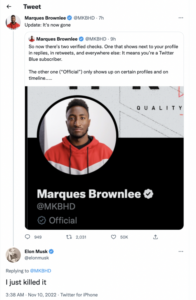 Here is where things get fun. A mere few hours after Twitter began the rollout of the new ‘official’ grey check mark, Musk took to his own Twitter to announce the idea had already been sacked via replying to a Tweet from popular content creator Marques Brownlee.